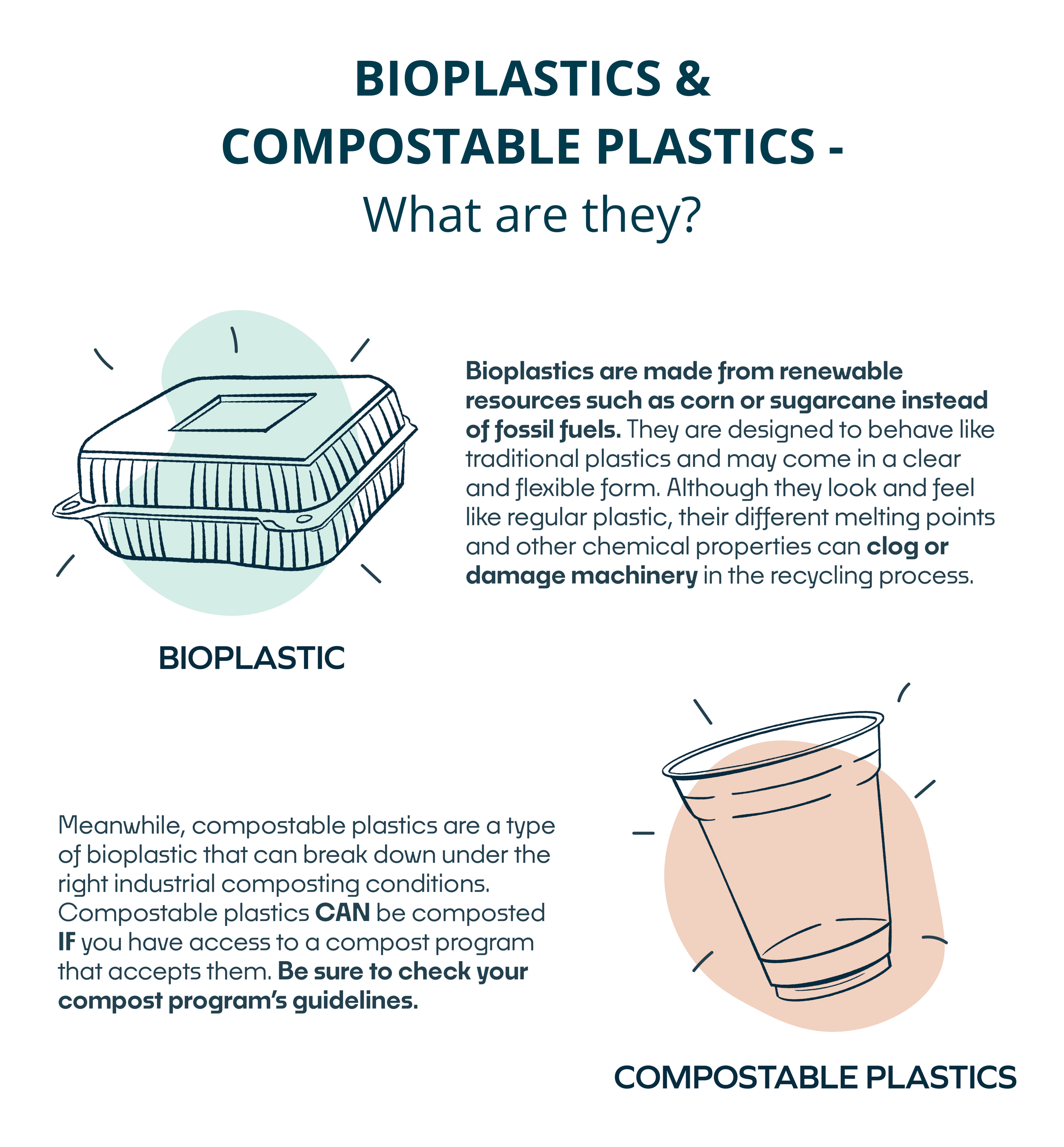 And most importantly, remember: Bioplastics DO NOT belong in the recycling bin and only certain types can be composted at industrial facilities.